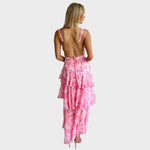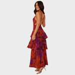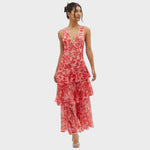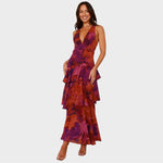 This long dress combines a sophisticated design with a fresh and light aura. The deep neckline adds a sensual and modern touch, while the overlapping layers create a dynamic effect full of movement. Perfect for standing out on any occasion – its unique style effortlessly radiates personality and elegance.