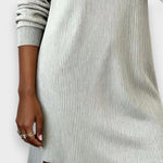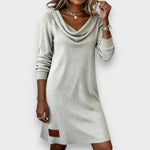 This stylish knitted dress combines timeless elegance with maximum comfort. The softly draping waterfall neckline and fine ribbed texture give the dress a feminine silhouette, while the subtle leather detail adds a modern touch. Perfect for everyday wear, the office, or a relaxed evening with friends.