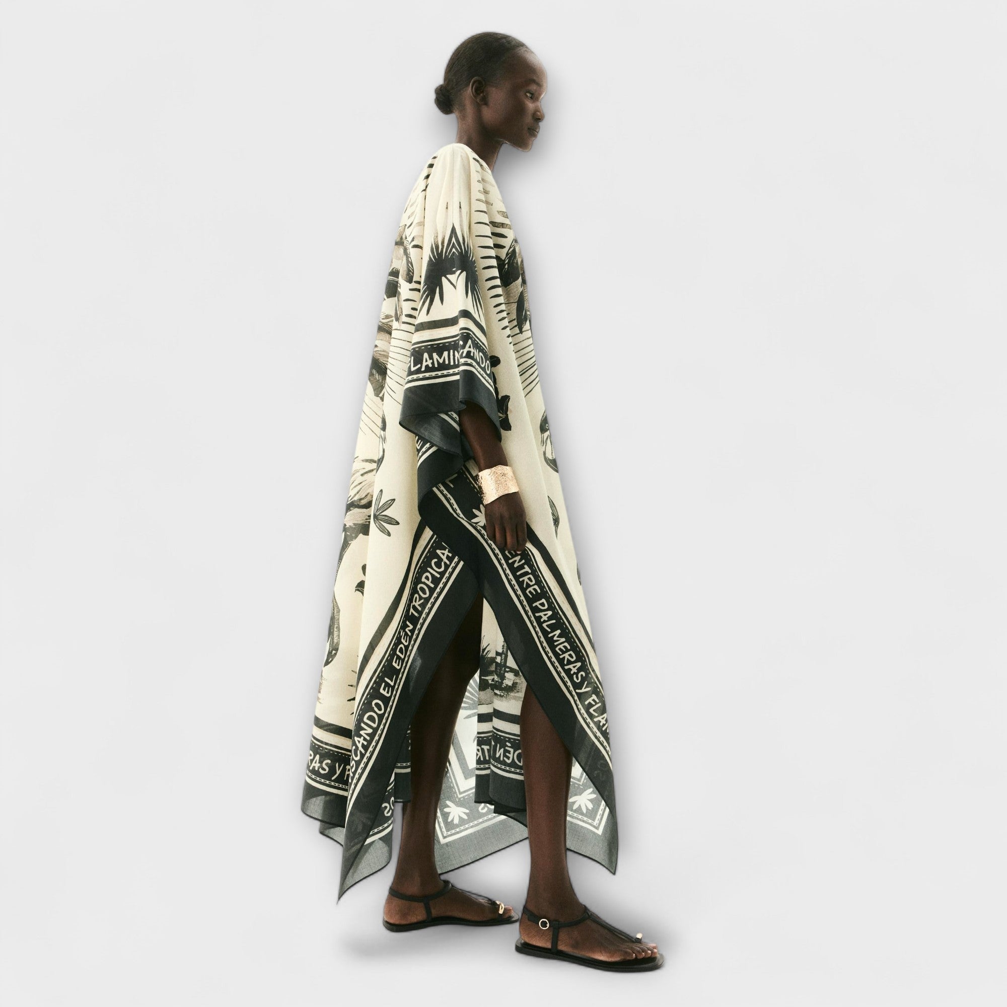 This stunning piece features a playful flamingo and palm print on a chic, light beige and black base.