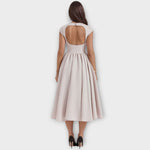 This black midi dress captivates with its elegant silhouette and stylish back cut-out. The fitted design with a flared skirt creates a feminine shape, while the small flutter sleeves subtly complete the look. The open back with button closure adds a modern, sensual touch to the classic style.