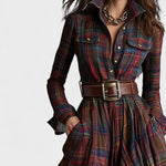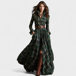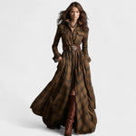 This sweeping maxi dress blends timeless tailoring with a bold, heritage aesthetic. The structured shirt-style bodice, complete with button detailing and chest pockets, creates a powerful contrast with the fluid, voluminous skirt. A wide statement belt cinches the waist for a sculpted hourglass shape, while the flowing fabric moves beautifully with every step. Designed for standout moments, it offers both sophistication and effortless confidence, whether worn for daytime elegance or evening glamour.