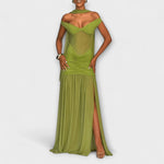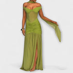 The dress is made from luxurious, stretchy slinky fabric in a rich olive green shade and is fully lined for comfort and style. The low V-back adds a sensual touch, while the ruching and high slit beautifully accentuate your figure.